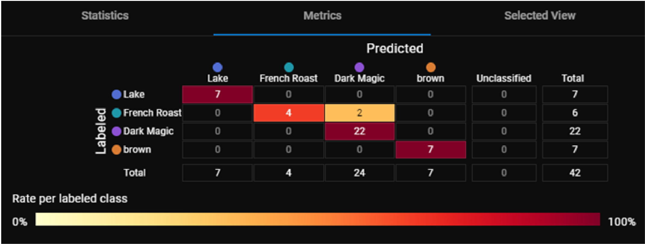 The Metrics tab consists of a confusion matrix and a table view of the results.