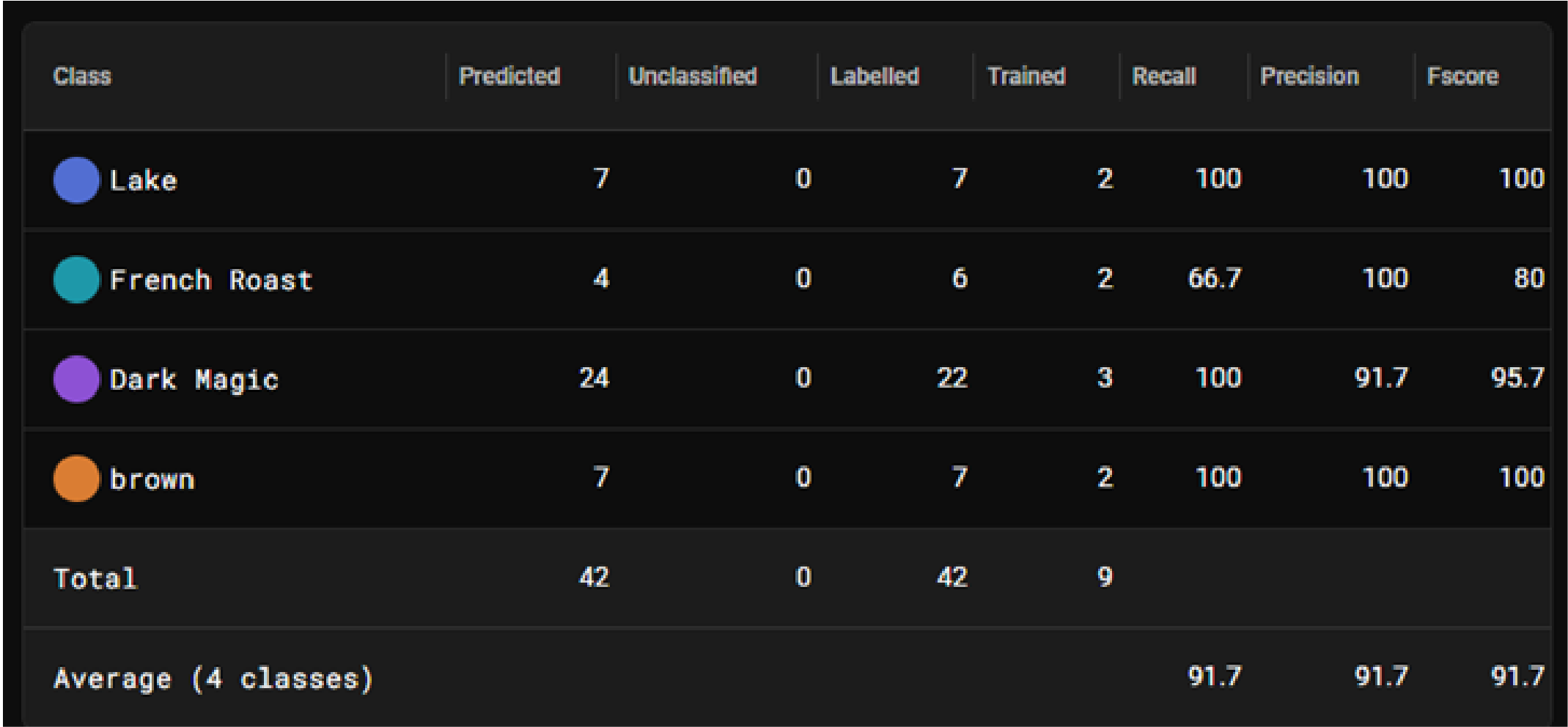 For example, the cell for features labeled as Dark Magic and predicted as Dark Magic contains the number 22. This cell is dark red because 22 is 100% of the total number of features labeled as Dark Magic. The cell for features labeled as French Roast and predicted as French Roast contains the number 4. This cell is a lighter red because 4 is only 66% of the 6 total features labeled as French Roast.