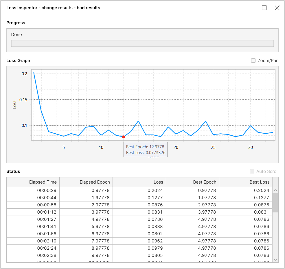The Best Epoch can be updated while the Loss is not changing at all. When the Loss is not reduced as epochs go by, the loss inspector picks an epoch among the ones with the same Losses by an internal metric, and then the chosen epoch becomes the Best Epoch. The table below is an example of the status that you can actually bump into when using the loss inspector.