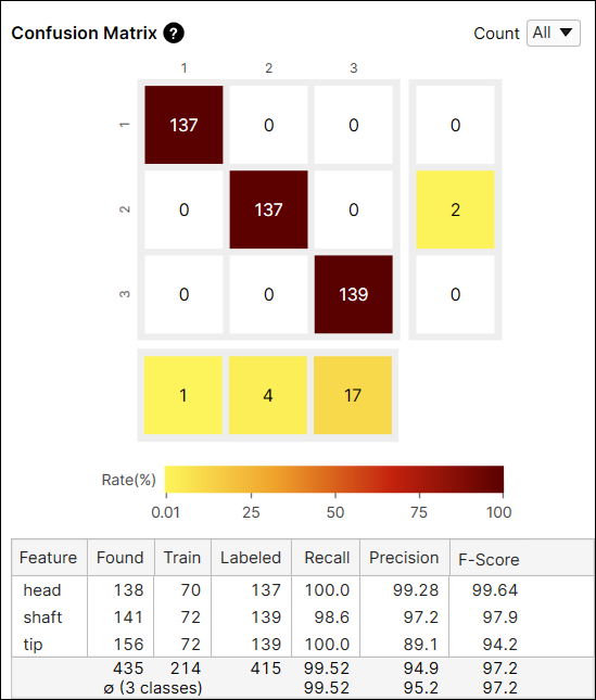 For another example, the color of the cell at the index (2,3) is yellow because among the features whose label is 'shaft' the number of features predicted as 'tip' is 2. The number of features predicted as 'tip' accounts for 1.4% (2/140) of the features whose label is 'shaft.'