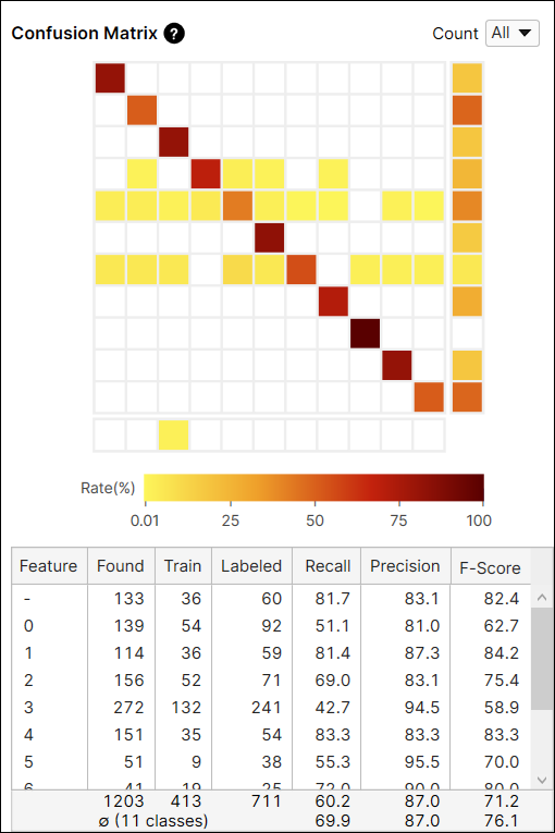 The Confusion Matrix is a visual representation of the ground truth versus the tool's predictions. The confusion matrix of the tool is a graphical representation of the Recall and Precision scores. Each row of the confusion matrix stands for the number of features that are labeled by user, which are the ground truths, and each column of the confusion matrix stands for the number of features that are predicted by the tool, which are the markings. If you click each cell at the Confusion Matrix on Database Overview, the corresponding item (views) in each cell of the table will be displayed on the View Browser.