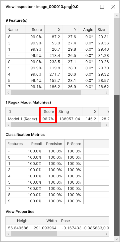 A found model is said to be a correct match (correctly marked model) if there is a labeled model in approximately the same position and if this found model has features that are close to the corresponding labeled features. The precision, recall, and F-score of model are calculated on this ground, and if there are multiple models in a view all model metrics are calculated by each model separately.