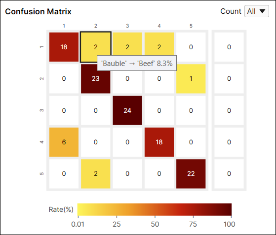 For another example, the color of the cell at the index (1,2) is yellow because among the views whose label is 'Bauble' the number of views classified as 'Beef' is 2. The number of views classified as 'Beef' accounts for 8.3% (2/24) of the views whose label is 'Bauble.'