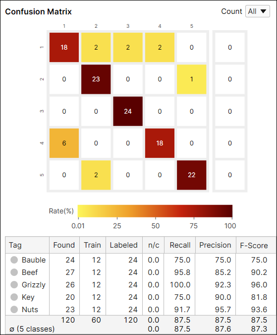 The Count option in the Confusion Matrix provides the result of the current tool calculated from all views (All), or only from the views that are not included in the training set (Untrained Views). You can switch the results between the one generated from every view including training and test images, and only from the untrained views which are the test images.