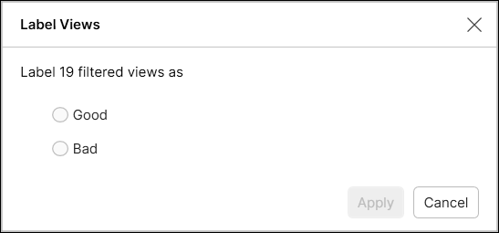 This option is particularly useful when you have a large number of images to label. Selecting this option launches the Label Views dialog, where you can define all of the images as either Good or Bad.