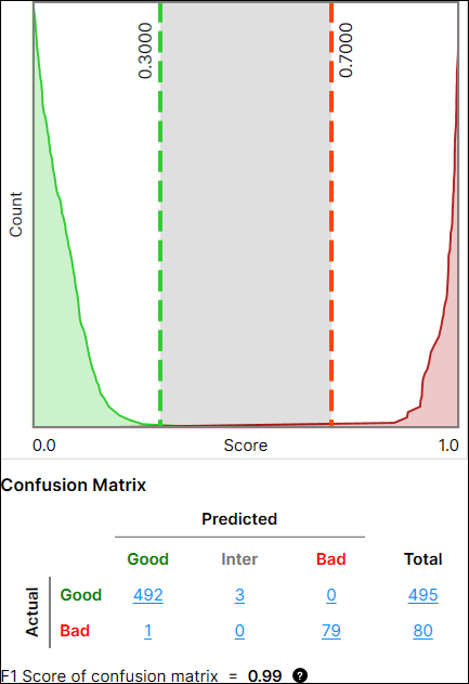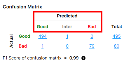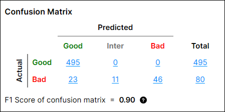 F1 Score of confusion matrix changes per the Count dropdown option. It is interpreted as the harmonic mean between the precision and recall of the current confusion matrix. If a view or a region is predicted as "Inter," it is counted as "Bad" for the calculation of precision, recall, and F1 Score.