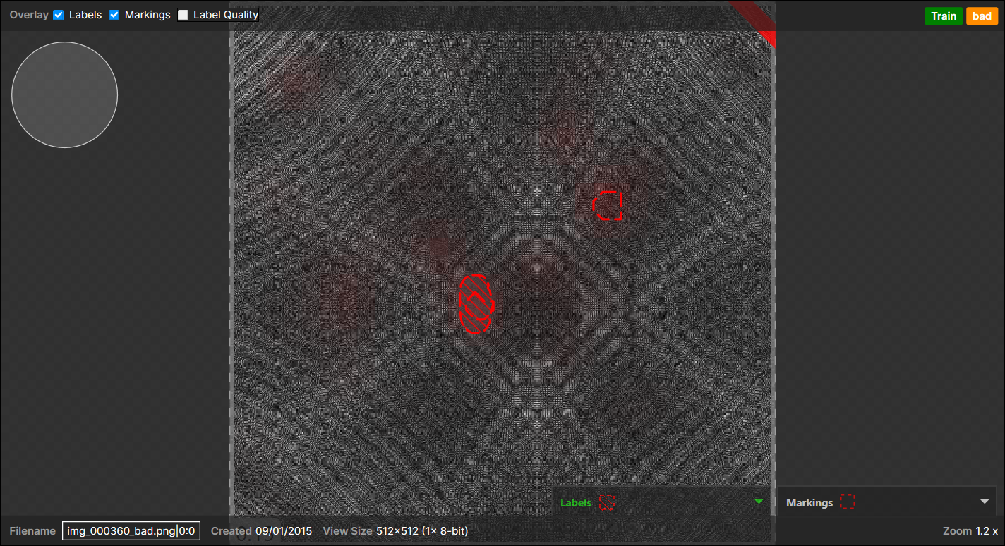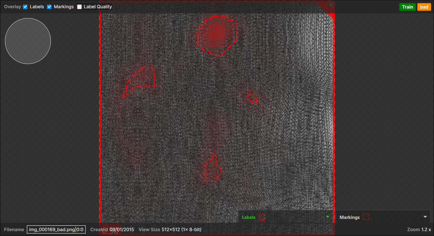 (N marked regions are considered as a single marked region)Example of 4 marked regions appear on the backgrounds, no pixel-wise labeled defects, "Bad" labeled view: