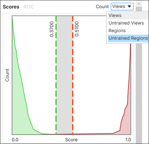 There are 4 ways to populate this table by Count dropdown option: Views, Untrained Views, Regions, and Untrained region. These are also used to draw "Score" graph (Score Distribution Graph).