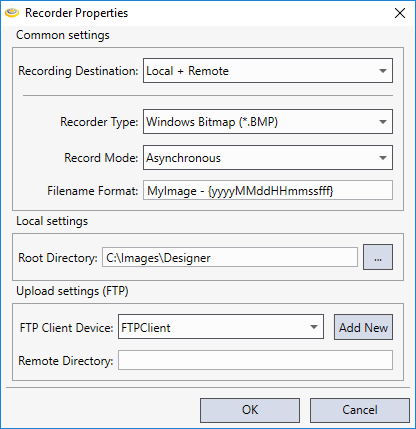 Note: This setting is available only if the Recording Destination property is set to Remote or Local + Remote.Remote Directory The remote directory on the FTP server where the images will be saved. In case the specified path contains non-existing directories, Cognex Designer will automatically create them when the upload starts.