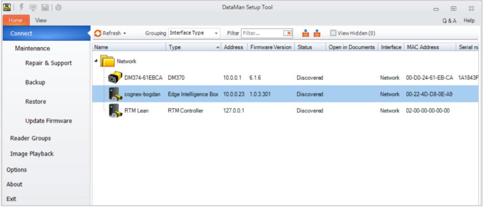 After connecting the Edge Intelligence, connect directly to a VGA monitor and peripherals or by using Cognex DataMan Setup Tool (6.1.8 or later) to discover and configure Edge Intelligence to access the Edge Intelligence web interface, which makes it possible to connect remotely via web browser from any device in the network.