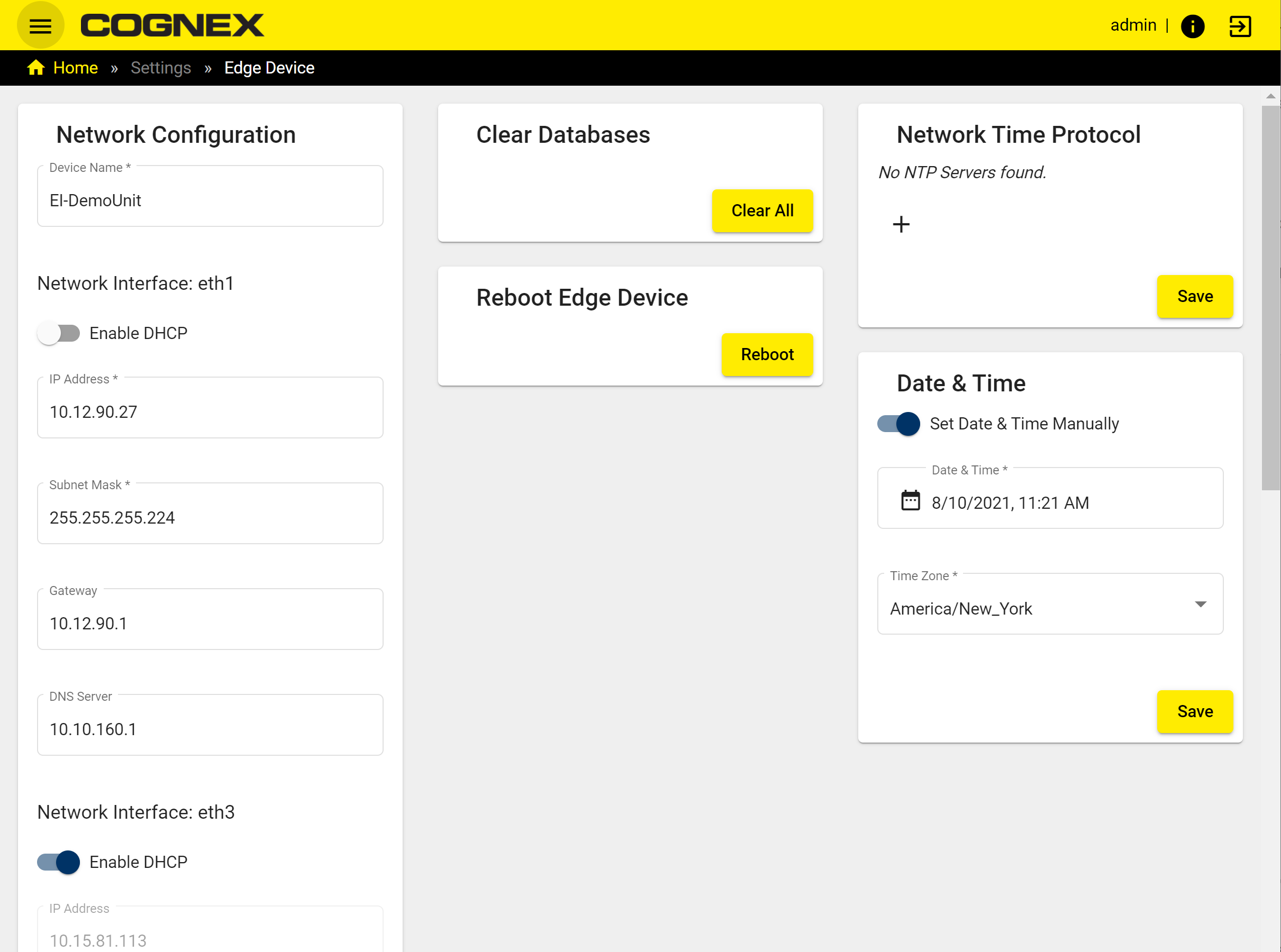 The Edge Device page shows the network configuration and allows editing and saving the network settings of the Edge Intelligence device.