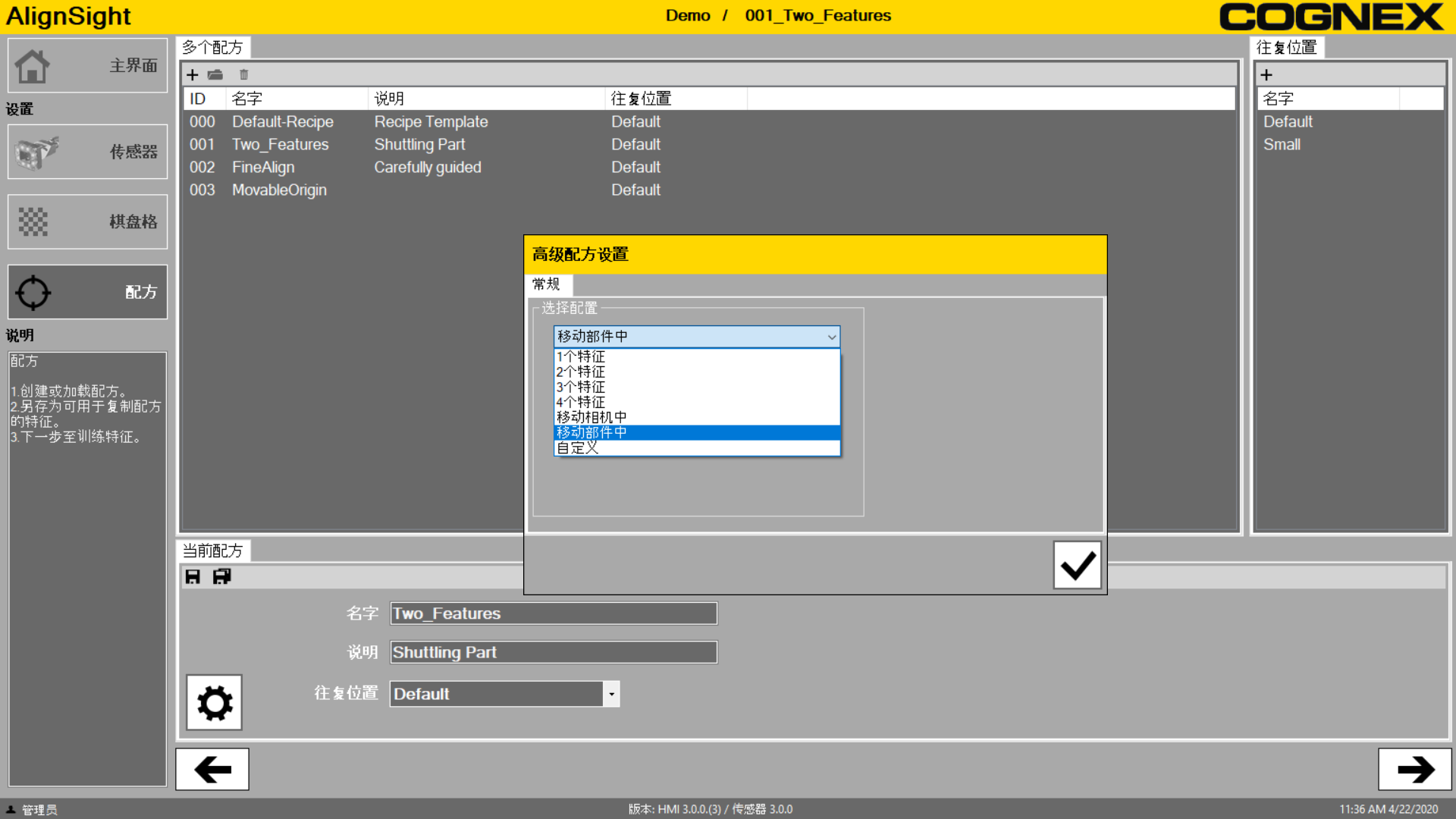 根据您正在移动的项目,请选择移动相机中或移动部件中。如果您拥有一个部件,其视野中具有两个特征,请选择无往复移动。