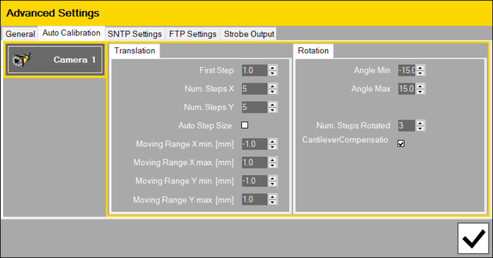 Note: It is required that the origin of the trained pattern is at the center of the training region (default). Manually moving the origin away from the center may cause Auto Calibration to fail. If this happens you can adjust the first step size to make sure the pattern doesn't move outside of the field of viewTranslation Settings