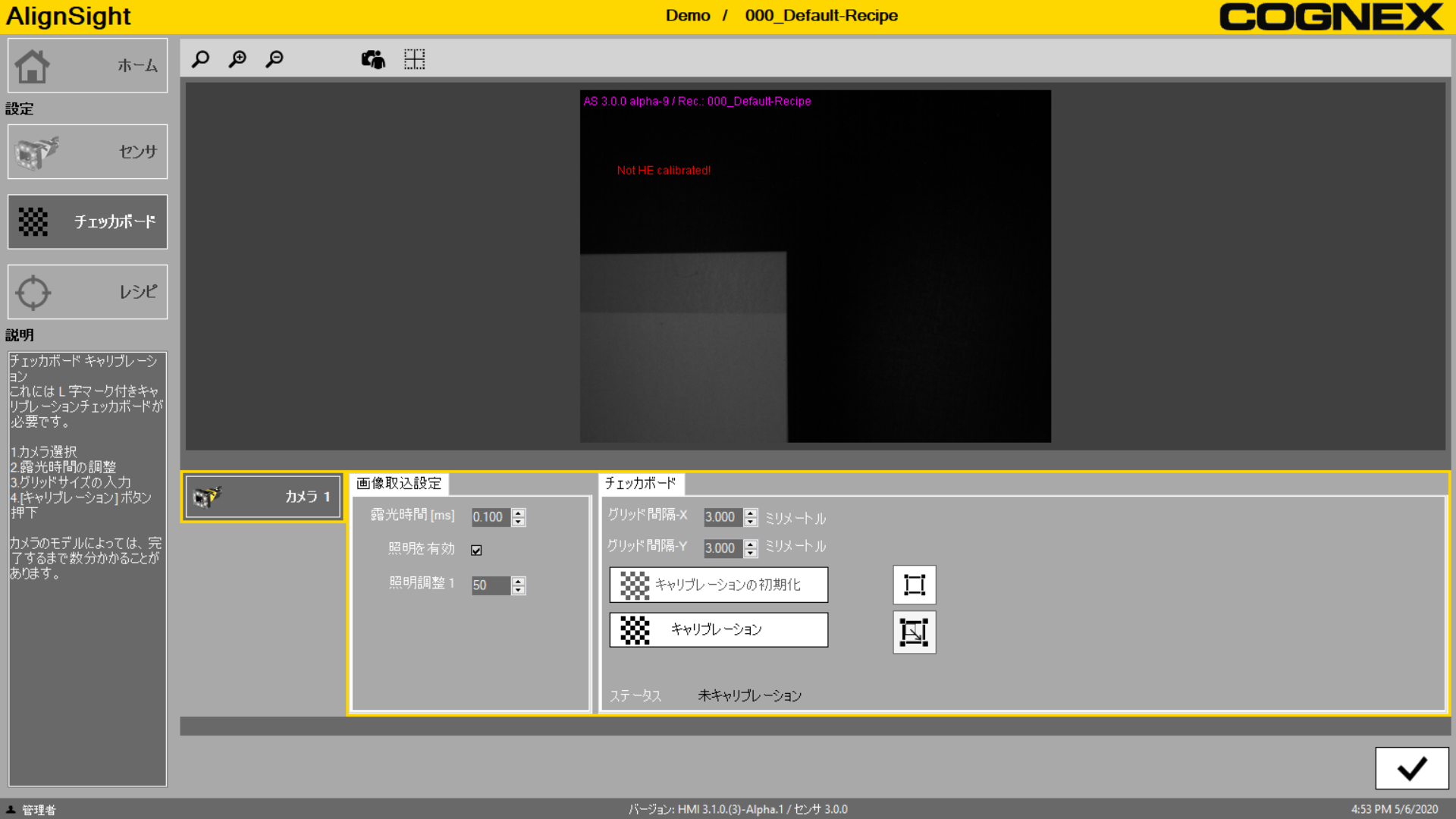 Note: 不適切な画像 (チェッカボードなし) でチェッカボードキャリブレーションを実行しようとすると、非常に長い時間がかかって HMI がフリーズすることがあります。場合によっては、手動でカメラの電源を入れ直すことが必要になります。