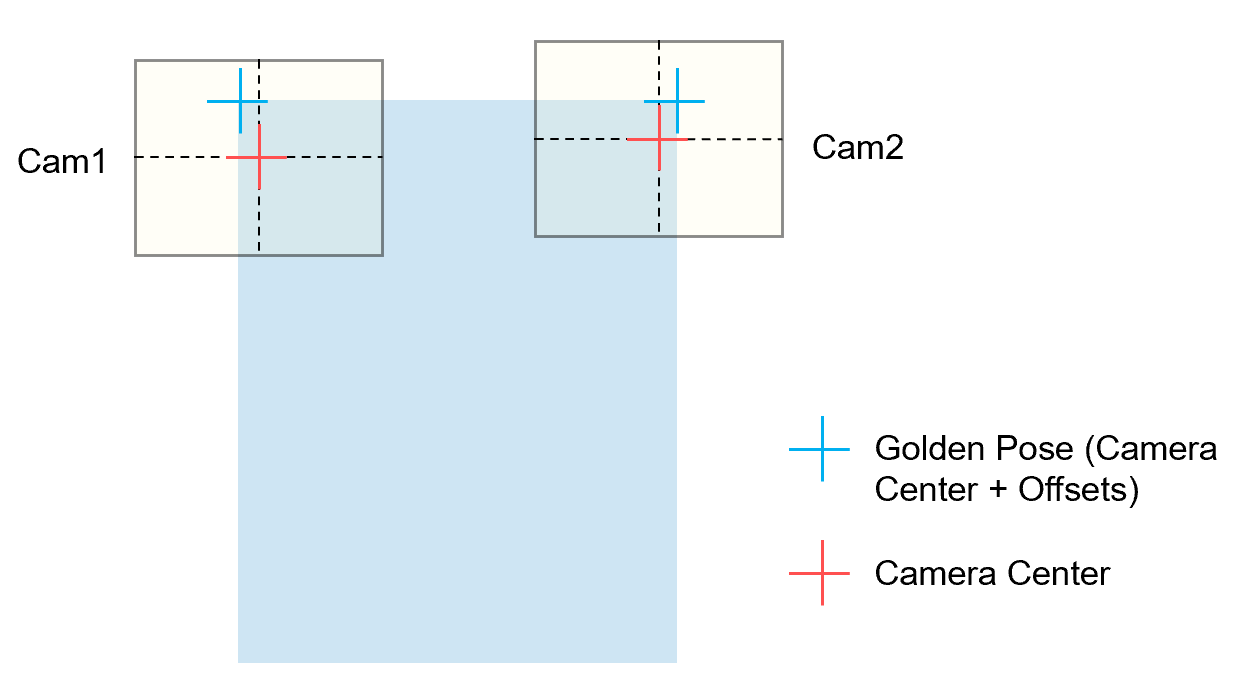 The Camera1 and Camera2 are installed mechanically not along the same direction with x or y direction of the stage, and golden poses are at the upper part of field of view of cameras so that longer edge features can be captured. Thus the centers of two cameras can’t be directly used as golden poses, offsets should be added to camera centers to set as golden poses.