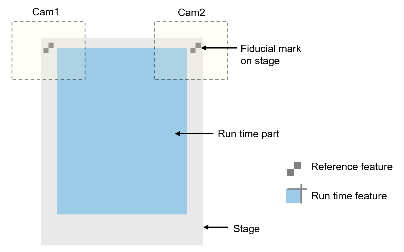 In the example shown below, golden pose is trained using fiducial marks on stage. While run time features are two corners of a part. This method requires the vision system to configure two sets of vision tools, one for reference feature finding, one for run time feature finding. The benefit of this method is that the golden pose would not change even run time part type is changed, thus it maintains the consistency of mechanical operation when it comes to align or assembly.