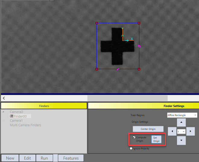 In applications where PatMax Finder's output feature should report location of a specific point on a fiducial mark, Compute Origin can be used to precisely locate the point. Here is an example: after Compute Origin is checked, two orange colored reference lines will be available on image display. User then can manually align these two lines to two perpendicular edges of the cross mark, thereafter click Set Origin button to let the finder compute the intersection of these two lines and set the result point as pattern origin.