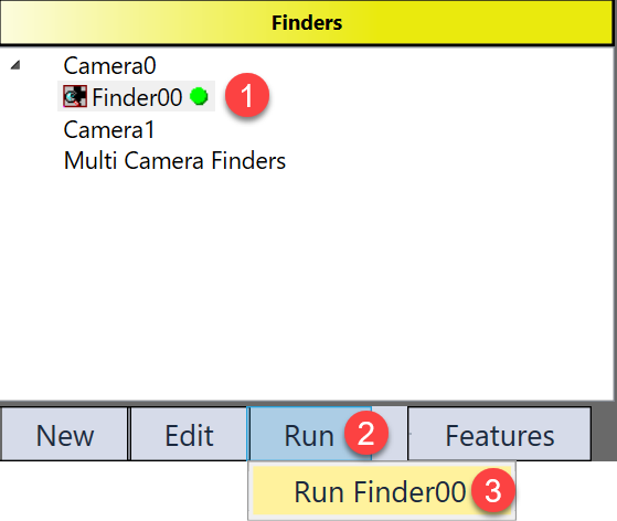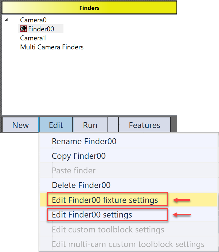 Once it is enabled, the reference features and run time features needs to be trained separately in the same PatMax finder. In the example below, Edit Finder00 fixture settings is for reference part feature finding, Edit finder00 settings is for run time part feature finding.
