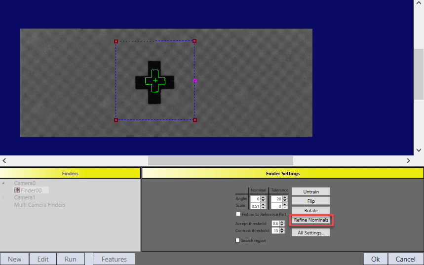 Once it is enabled, the reference features and run time features needs to be trained separately in the same PatMax finder. In the example below, Edit Finder00 fixture settings is for reference part feature finding, Edit finder00 settings is for run time part feature finding.