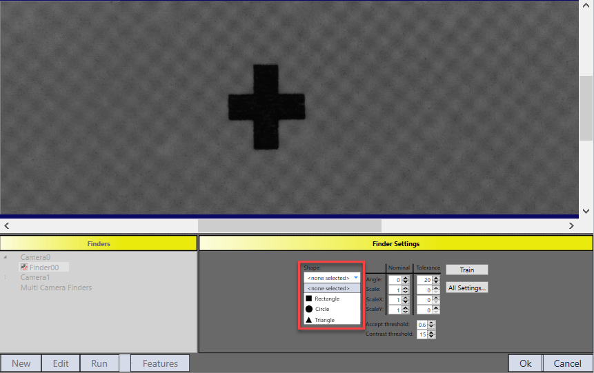This finder offers rectangle, circle and triangle shapes for user’s immediate choice. As for other shapes such as cross, manual drawing in Synthetic mode in advanced options of PatMax is needed.