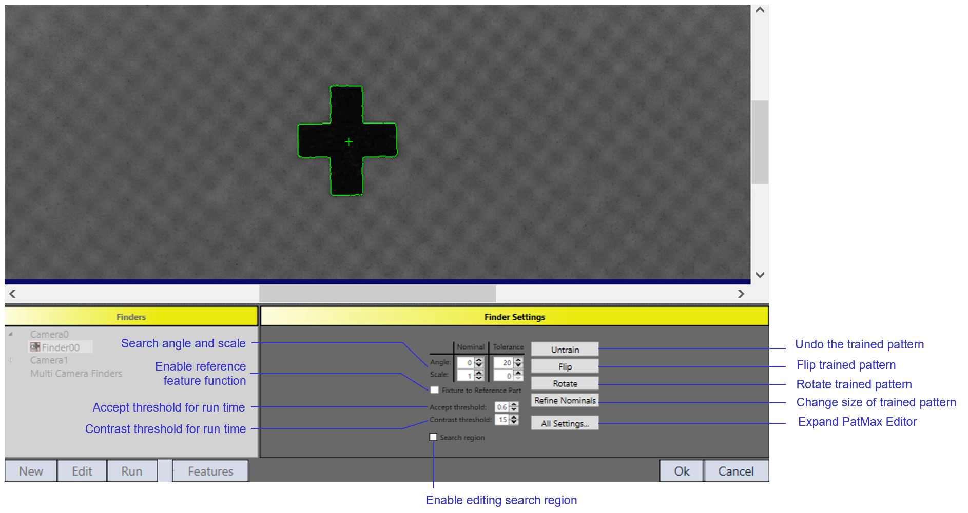 PatMax Pattern (Image) finder is a simplified PatMax tool which makes user focus on train time and run time parameter settings.