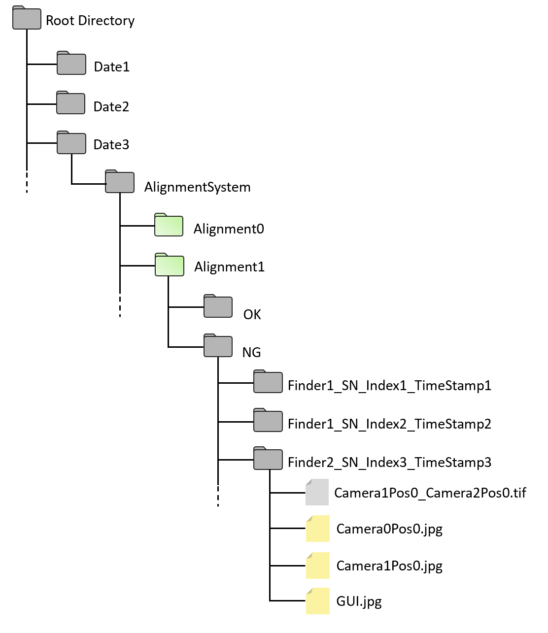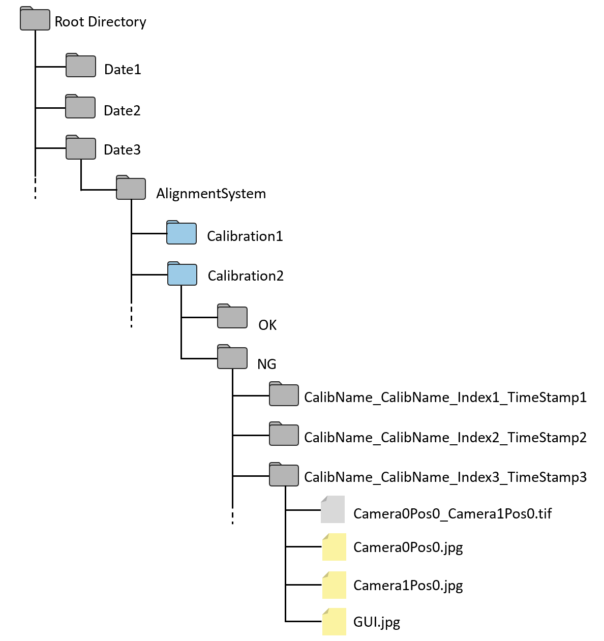 All images would be saved under root directory but will be distributed into different sub directories depending on date, alignment system, station name, etc. Here is the directory structure for calibrations and feature finders.