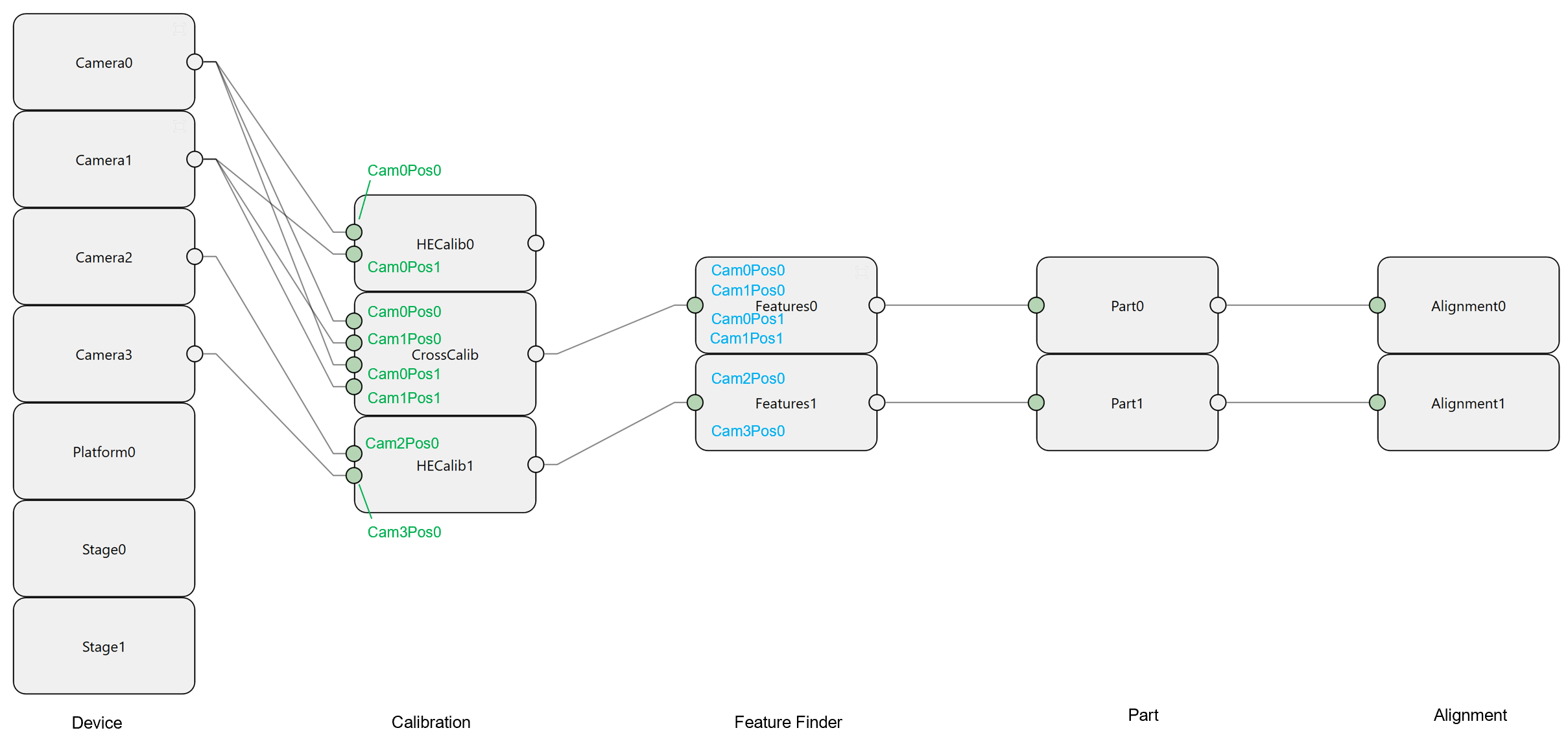 Images files are named using AcqName which is composed of two parts: camera name and position name, such as Camera0Pos0, or Camera1Pos0. In the example below, all AcqNames are marked for calibrations and feature finders in configuration wizard: