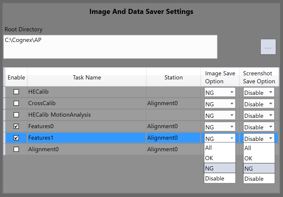 Task Name The task whose images are to be saved: every calibration, feature finder, motion analysis, and alignment tasks can save images independently