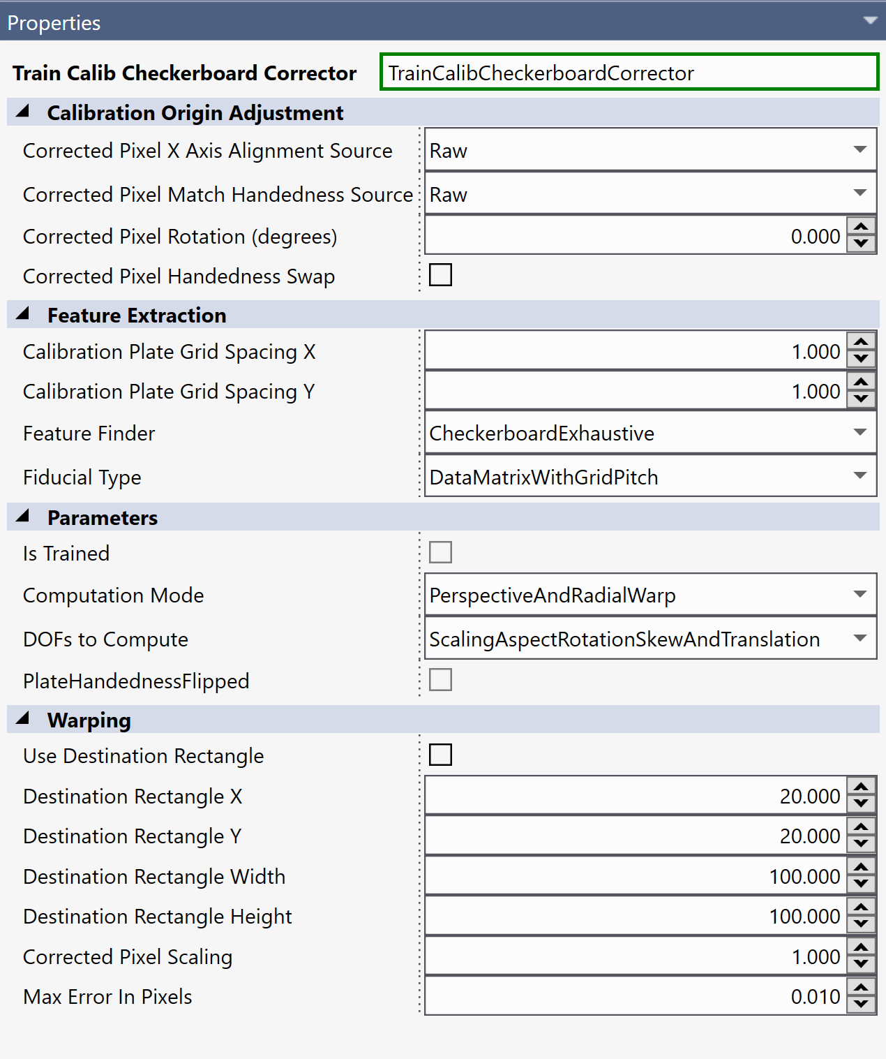 Name Type Description Use Destination Rectangle Boolean Get/set a boolean indicating if the "DestinationRectangle" properties will be used during training. The destination rectangle specifies which pixels will be present in the corrected image. The "DestinationRectangle" properties are in '.' space. See the VisionPro CogCalibCheckerboardTool.Calibration.OwnedWarpParams.WarpDestinationRectangle property. If UseDestinationRectangle is false (or not connected), all of the pixels in the corrected image will be output. Changes to this or any of the "DestinationRectangle" properties will cause this corrector to become untrained. Destination Rectangle X Double Get/set the X origin of the destination rectangle. See the UseDestinationRectangle property. Destination Rectangle Y Double Get/set the Y origin of the destination rectangle. See the UseDestinationRectangle property. Destination Rectangle Width Double Get/set the width of the destination rectangle. See the UseDestinationRectangle property. Destination Rectangle Height Double Get/set the height of the destination rectangle. See the UseDestinationRectangle property. Corrected Pixel Scaling Double Get/set an additional scaling factor to be applied during correction. See the VisionPro CogCalibCheckerboardTool.Calibration.OwnedWarpParams.WarpScaling property. If this property is changed, this corrector will become untrained. Max Error In Pixels Double Get/set the maximum error allowed during image correction, measured in pixels of the training image. See the VisionPro CogCalibCheckerboardTool.Calibration.OwnedWarpParams.WarpMaxErrorInPixels property.