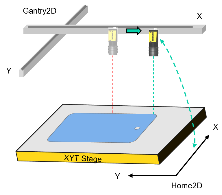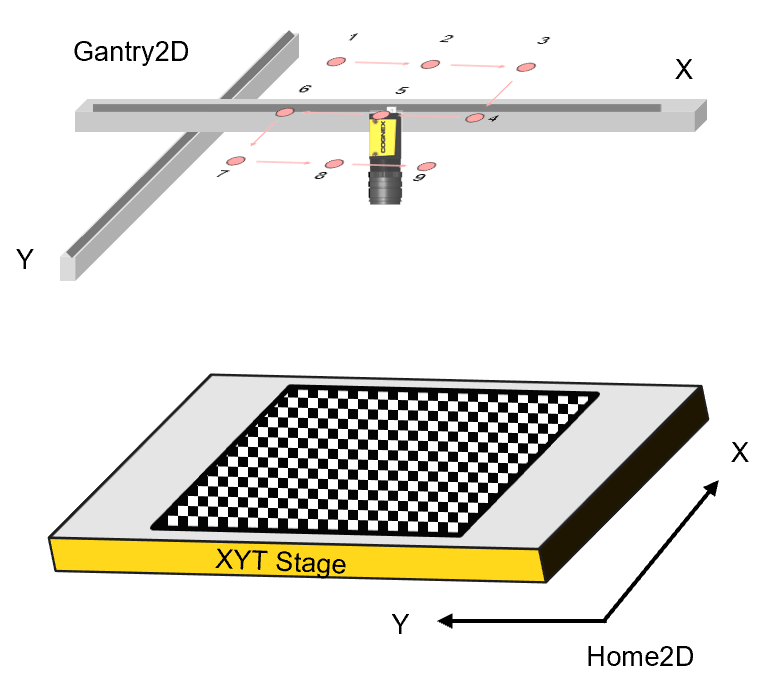During calibration time to first set up the machine, one time calibration establishes the relationship between the gantry's space and Home2D by running a single-camera moving hand-eye calibration for each camera, wherein the camera is moved by the gantry over a checkerboard plate to a serial of different points specified by the Looping Parameters. In the graphic below, the gantry moves along a 3x3 grid.