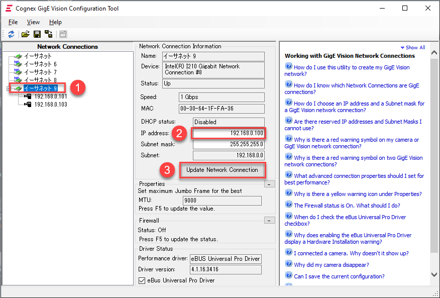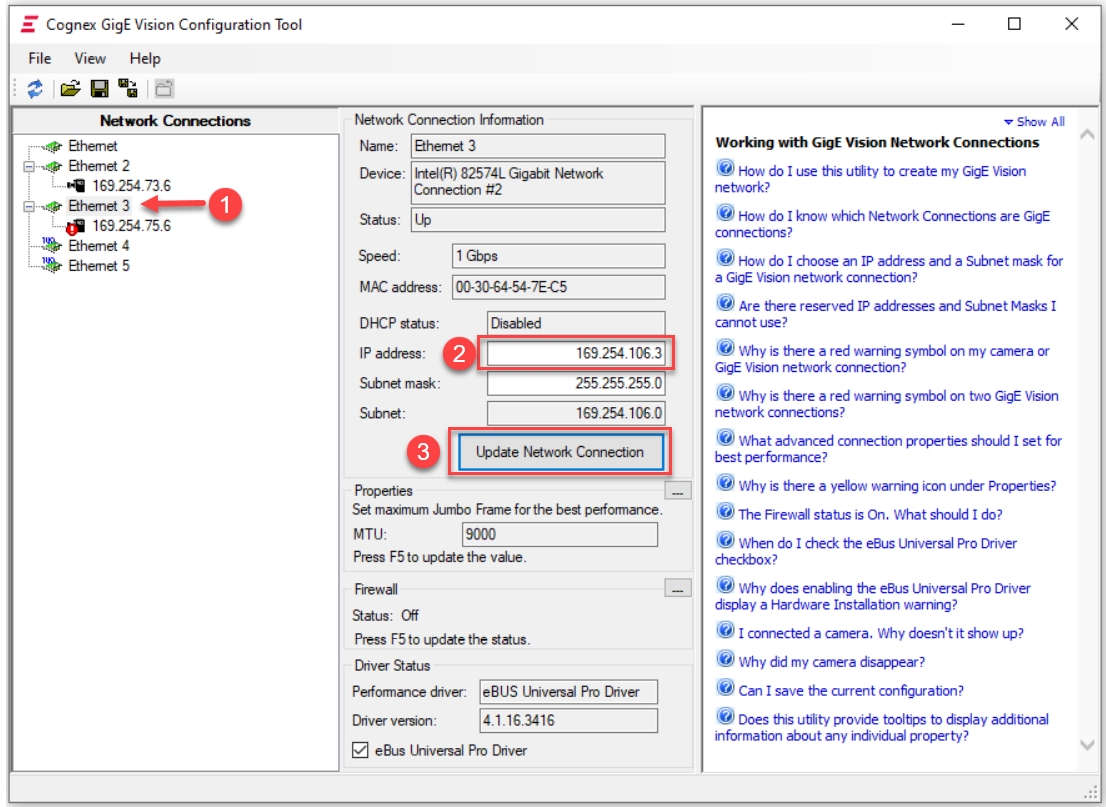2. In the opened GigE Vision Configurator UI, change camera's IP address or Ethernet card IP address to make them in the same subnet.