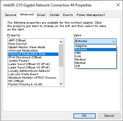 5. Change the Interrupt Moderation Rate property to Extreme in the list.