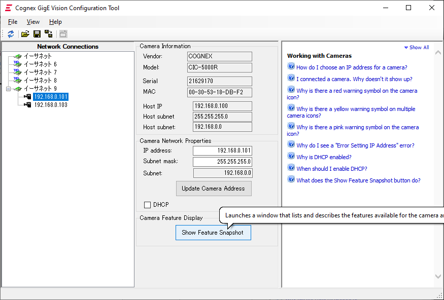 7. Click “Show Feature Snapshot” shown below in order to confirm that the control layer of GigE Vision protocol is working.