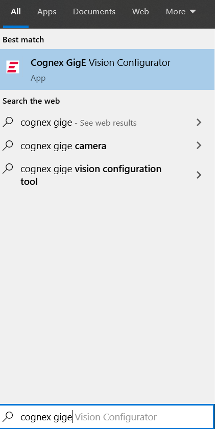 1. Type "Cognex GigE Vision Configurator" in windows command window and open GigE Vision Configurator.