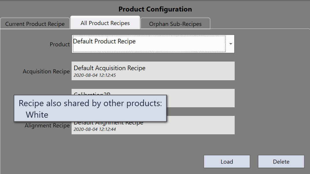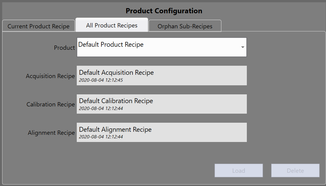 Product recipe is the master recipe which maintains the name list of sub recipes. Product recipe does not save any other specific data. Under each product, there are three sub recipes: acquisition recipe, calibration recipe and alignment recipe. Here is the summary of the three sub recipes: