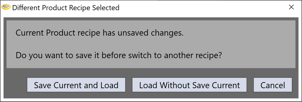Loads the selected product as current product. If the current recipe or the sub recipes have unsaved changes, a message window will pop up to allow the user to perform desired action.