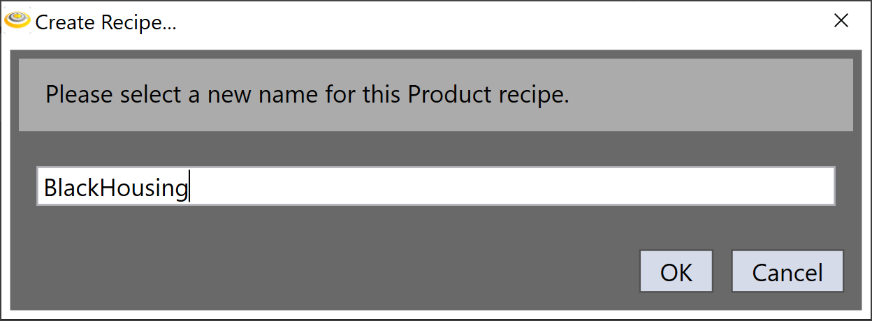 Click New button to create a new product recipe as well as the sub recipes. This new product name will be selected as current product. Note if any sub recipe with the given name already exists, the existing sub recipe will be used instead of creating a brand new sub recipe.