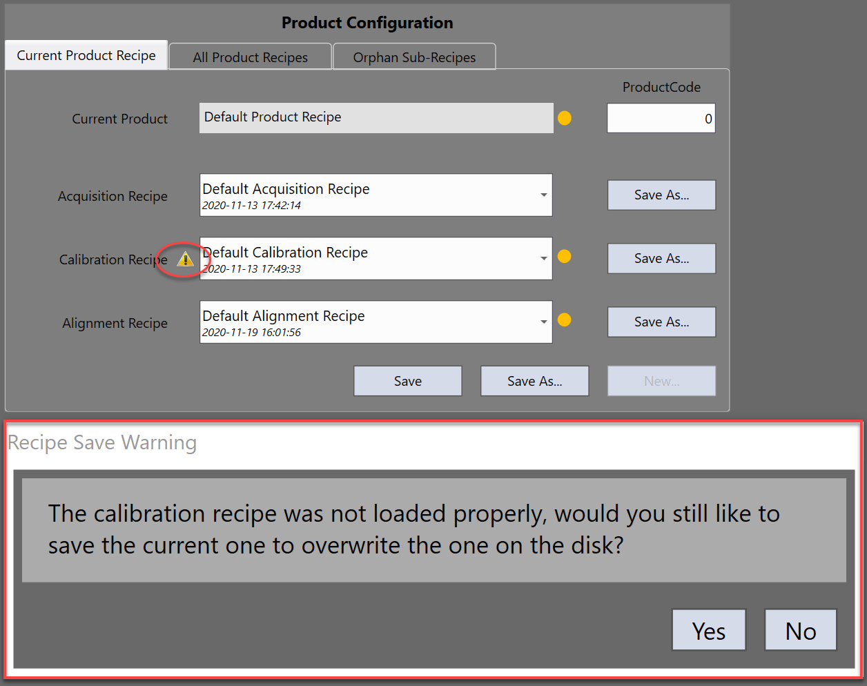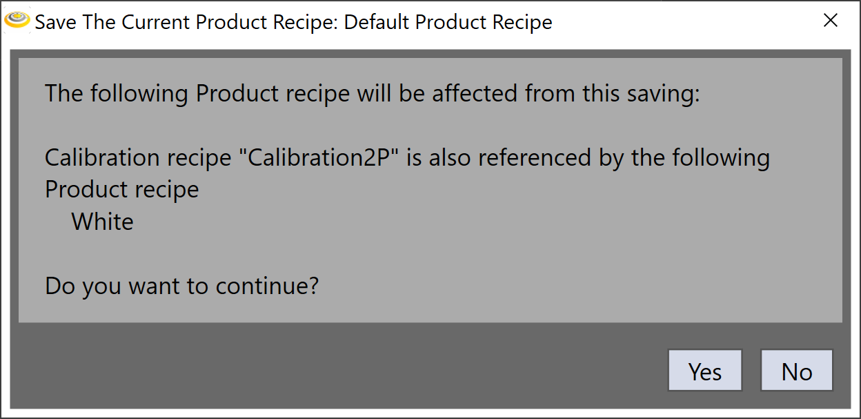 If the current recipe was not loaded properly, clicking the "Save" button will pop up a message window to confirm with you whether you want to overwrite the one on the disk.