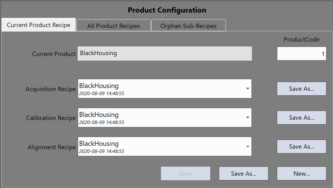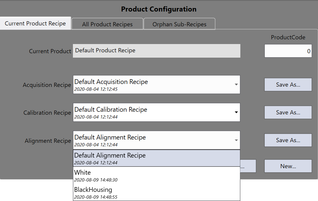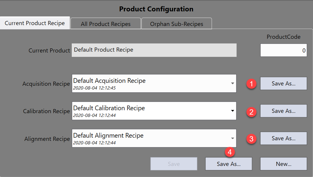 For each individual sub recipe, the Save As button allows the current state of the sub-recipe (Acquisition, Calibration or Alignment) to be saved under a different name. This sub recipe's new name will be selected for the current product recipe. This function can be used to backup recipes.