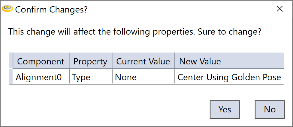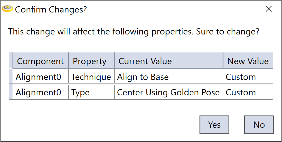 When the alignment component connects to the second part, the wizard will change its type to "Custom" for assembly applications; click "Yes" in the pop-up dialog to continue, you can change the type afterward. If it is inspection applications, then the alignment component type will stay as "AOI".