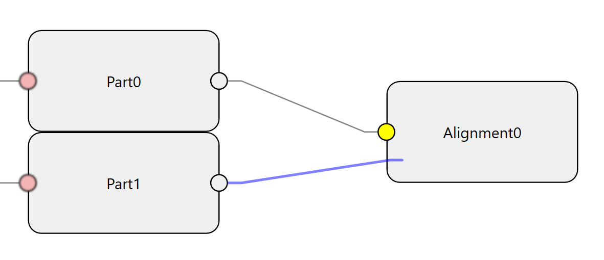 Alignment needs to be connected to at least one part component before it can be configured. For alignment applications, this component only needs to connect to one part. For assembly applications, it should connect to the two parts that will be assembled together afterward. For inspection applications, this component can connect to one or two parts as long as these parts' AOI features share the same coordinate space and with different feature names.
