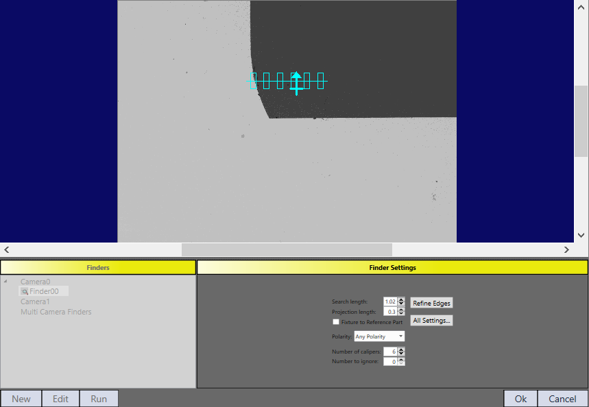 Line finer only finds edge points within its search length. Therefore, to cover run time part location variances, it is recommended to make the search length long enough during setup time. A easy way to adjust search length is to drag and drop the cross mark on CogFindLineTool interactive graphic.
