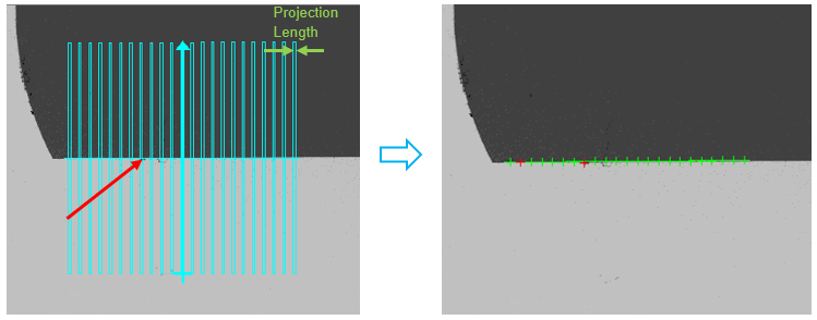 Projection Length is the width of calipers. The selection of proper width is based on the length of expected edge and the evenness if it. Here are two extreme cases: