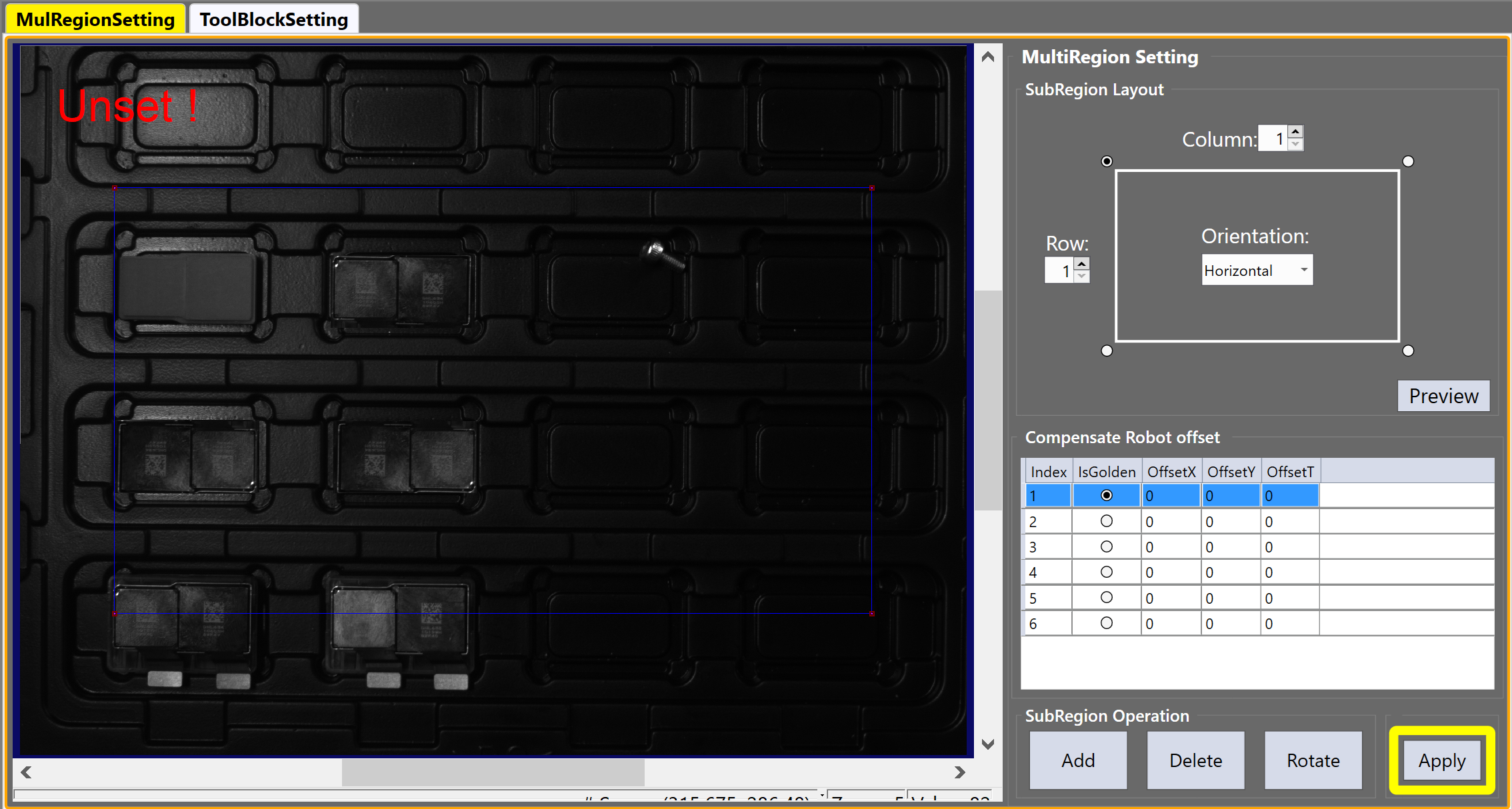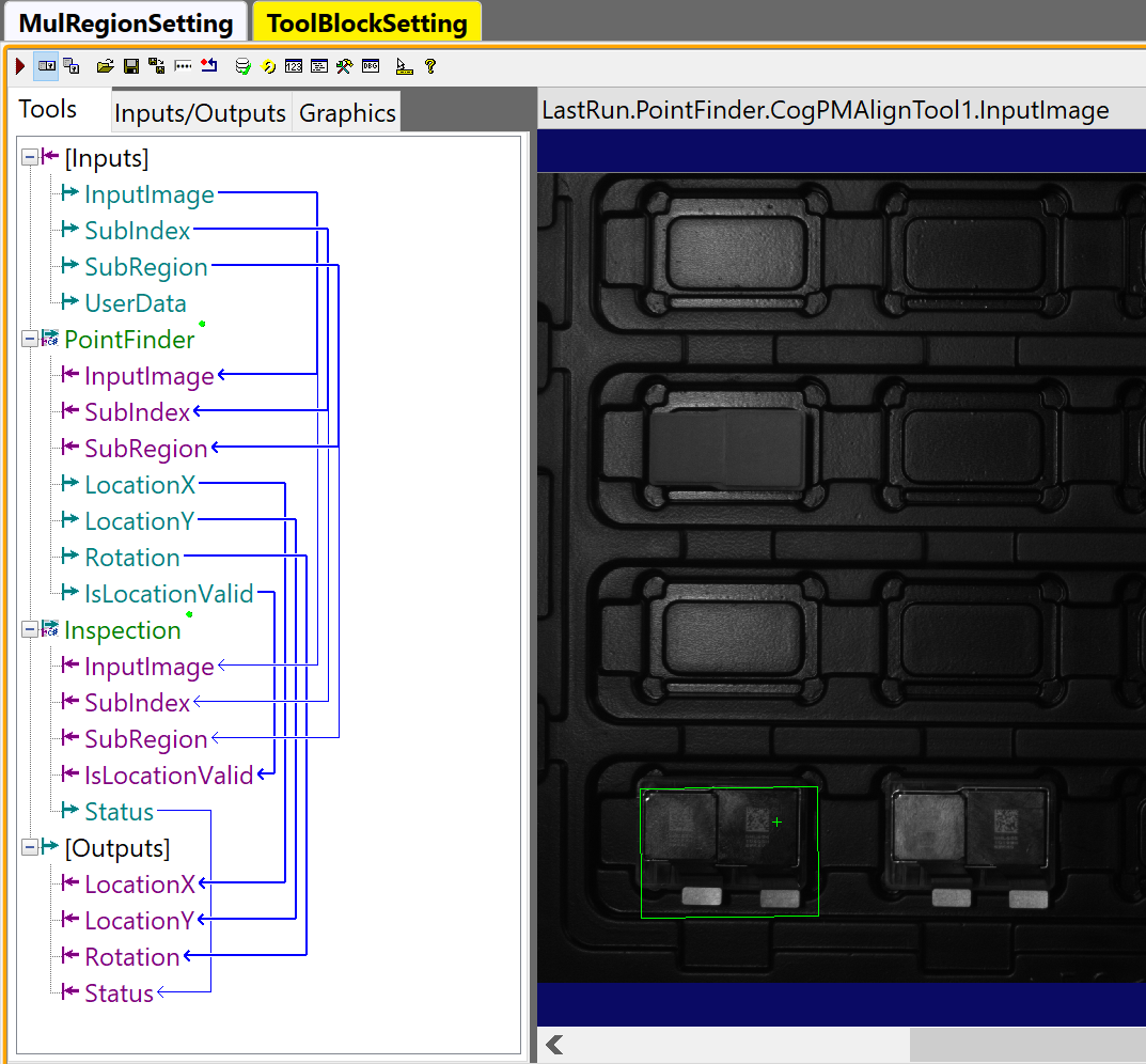 ToolBlockSetting allows users to customize vision tools for all sub regions. Since all parts are of the same type, the user only needs to configure vision tools in one sub region during the setup, then the finder will automatically search parts in all sub regions during run time.
