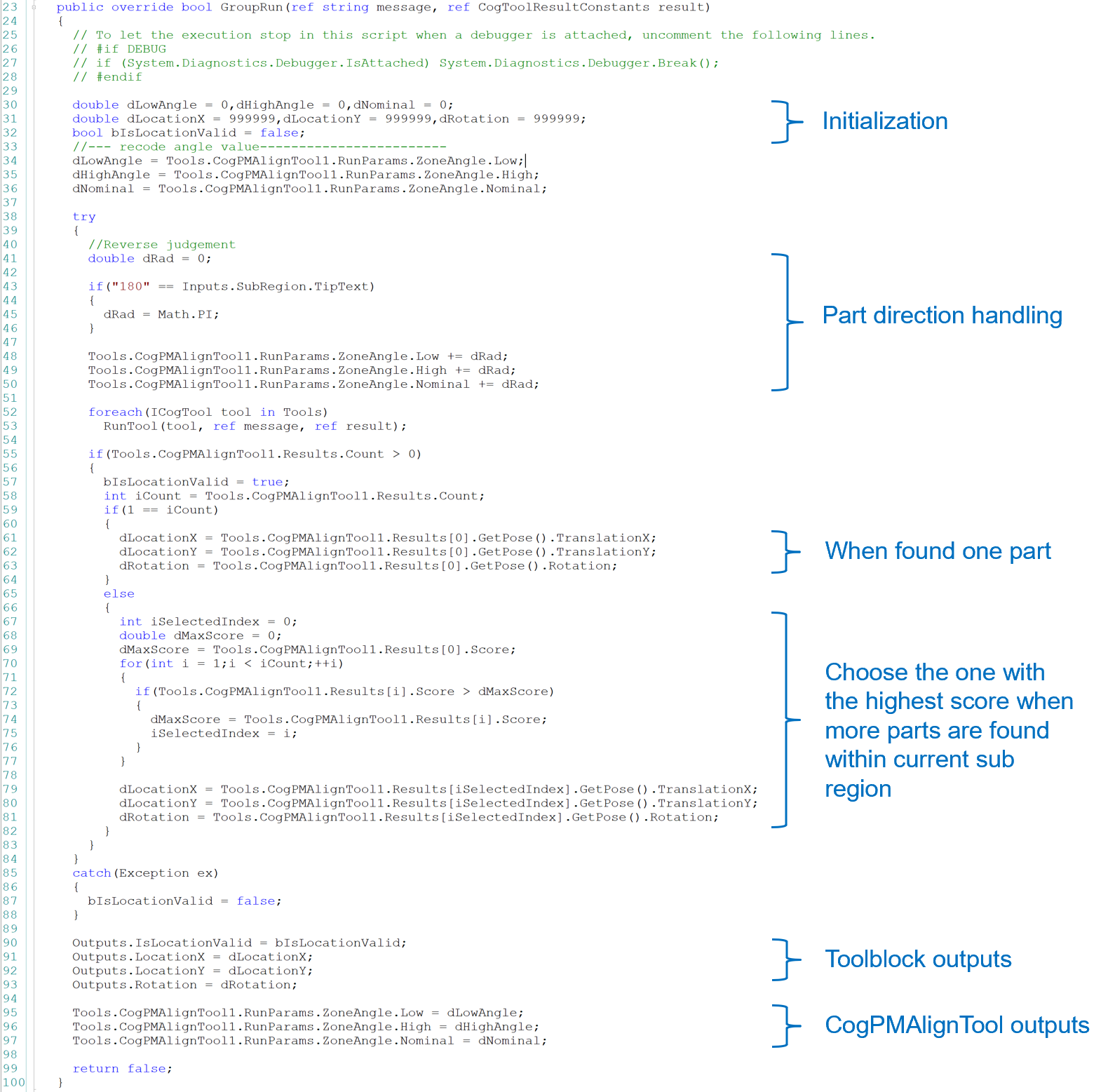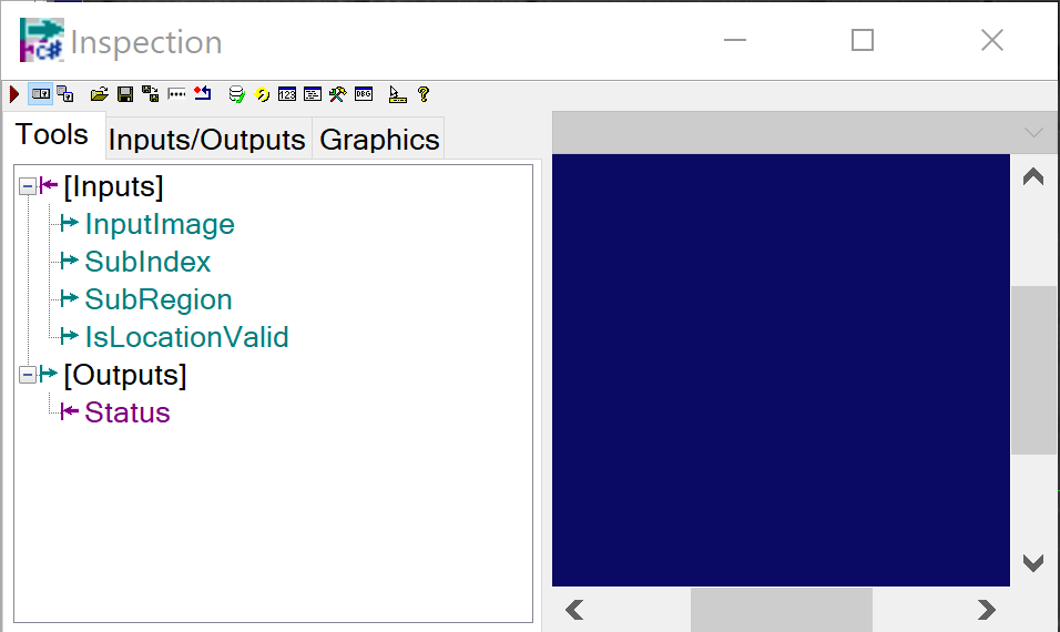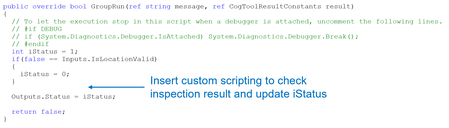 The output of Inspection toolblock is an Boolean object which only indicates whether the Point Finder and Inspection results are both successful for the current sub region. However, it now only indicates the Point Finder result as the Inspection toolblock is empty inside by default. The script below shows where the value of iStatus output should be updated after specific tools were added by user in the Inspection toolblock.