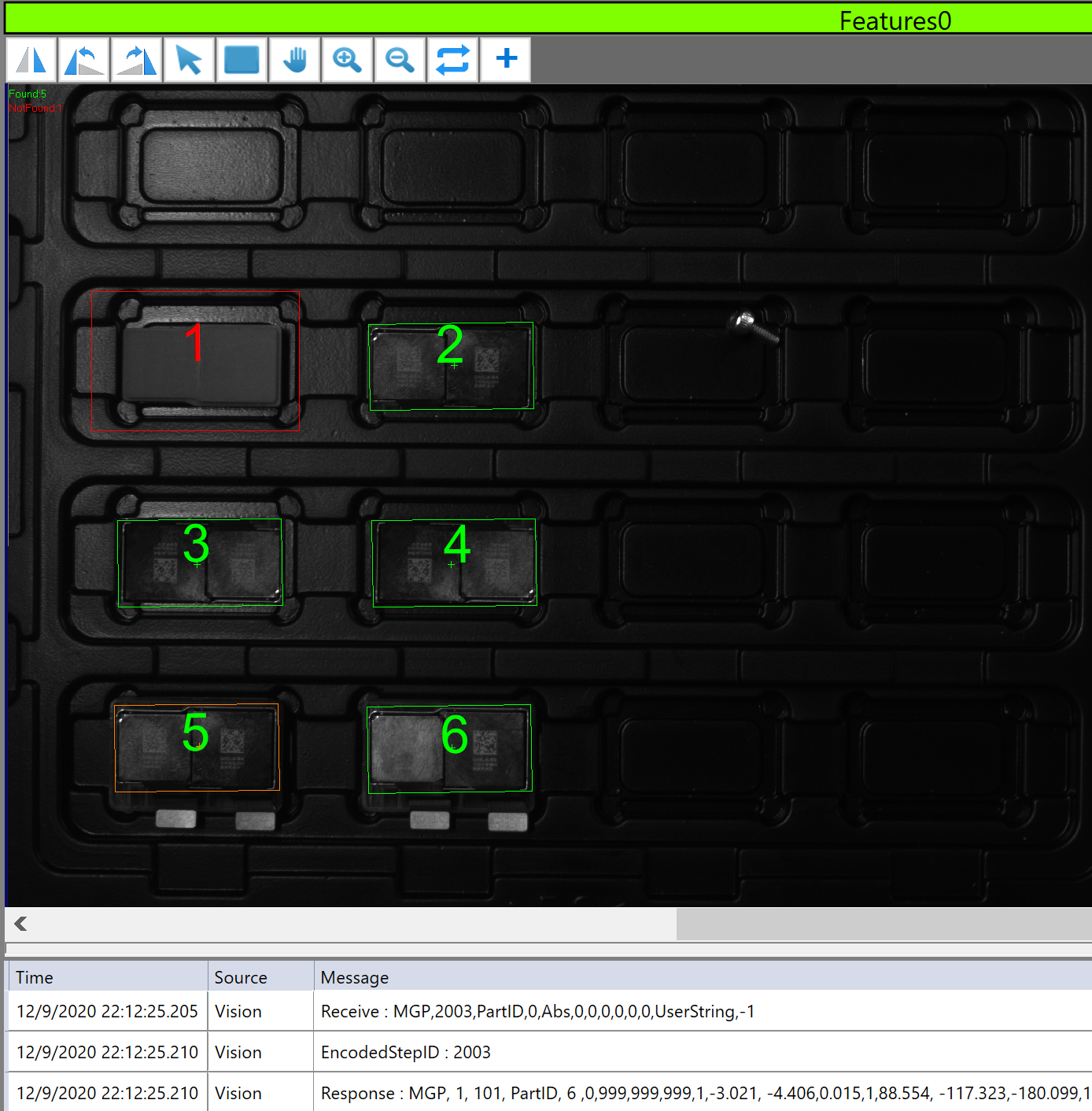 During run time, the multi-part features finder searches parts in all sub regions and returns each sub region's found status, part's locations if they are found. On the image display, if a part is found within a sub region, it will be labeled in green ( the master part's region will be marked as orange), otherwise in red.