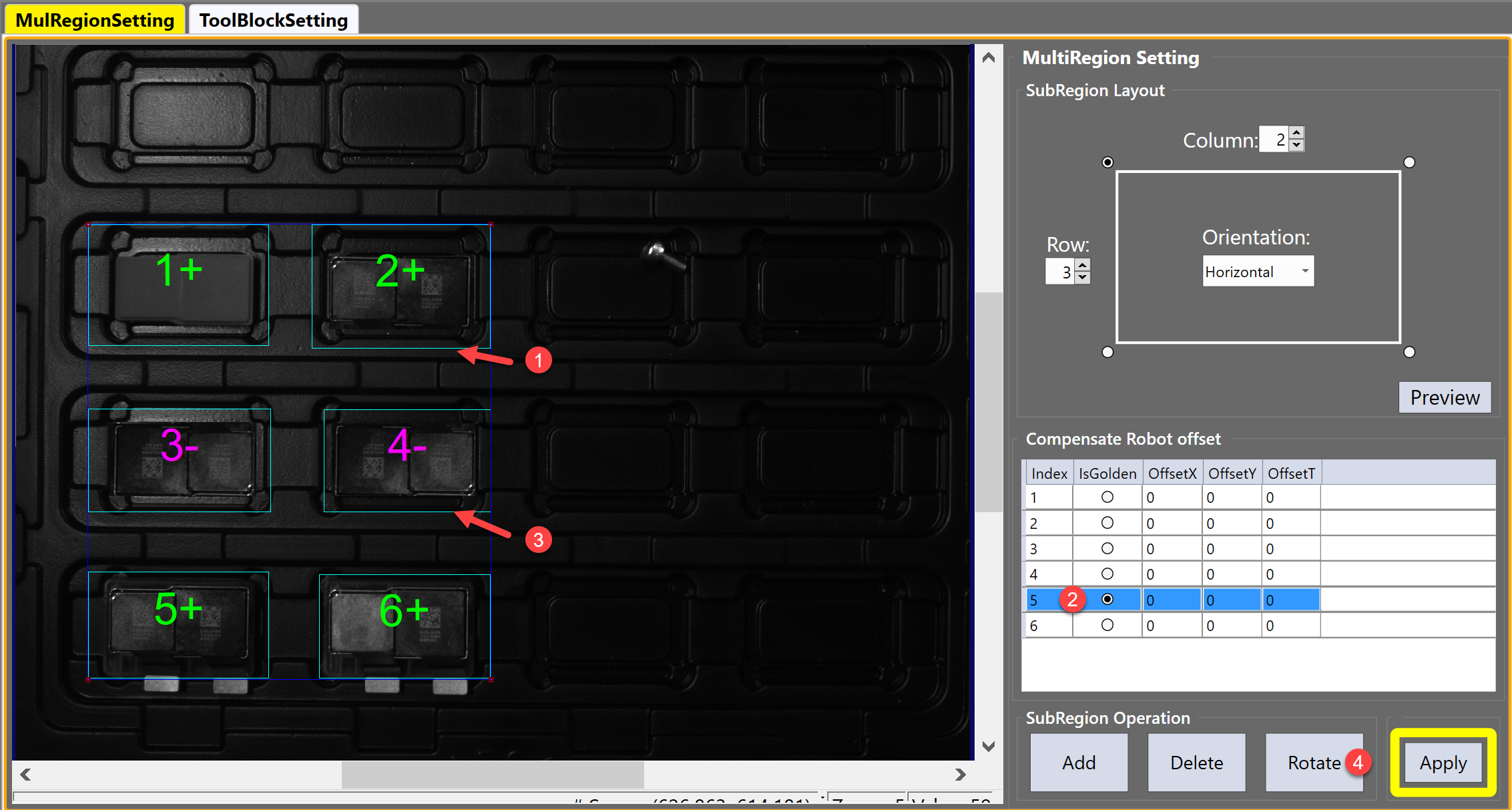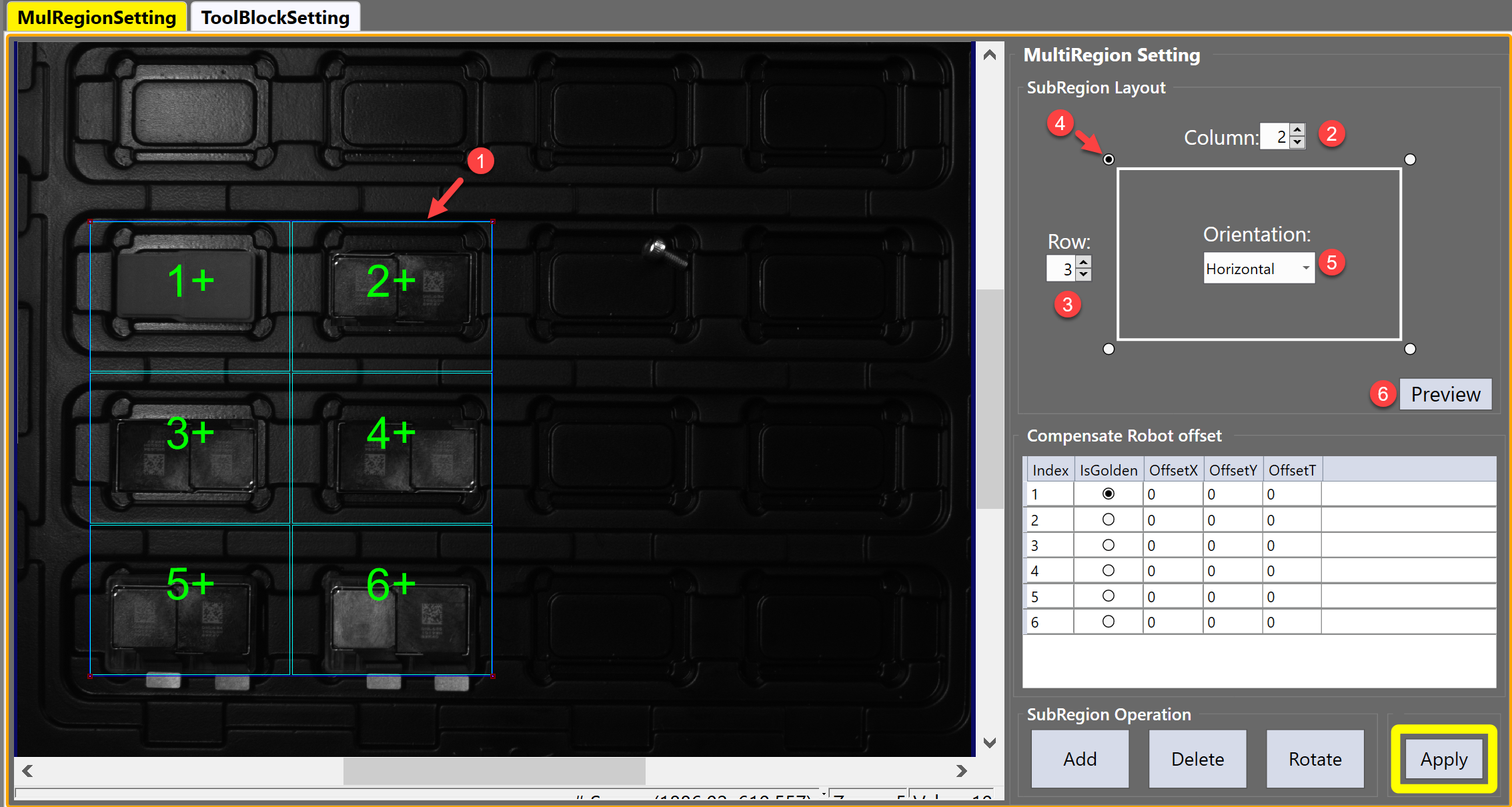 It takes two steps to configure a multiple-part finder: 1) Sub region configuration, 2) Vision tool setting. Sub region configuration is to configure search region for each pocket of the tray (functions available on MulRegionSetting sub-page). Vision tool setting is to set vision tools to locate parts in all sub regions (functions available on ToolBlockSetting sub-page).