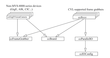 Classes representing Cognex hardware all derive from the ccBoard, ccFrameGrabber, and ccParallelIO classes. (Remember that for GigE applications, the camera is the frame grabber.)