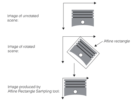 For example, if you are using a non-rotation-invariant tool to measure a part, and input images may contain rotated instances of the part, you can use the Affine Rectangle Sampling tool to produce an un-rotated version of the input image.