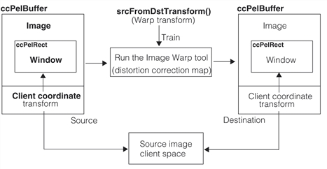 To use the Image Warp tool it must be trained with a warp transform and other information about the source pel buffer and the destination pel buffer. The warp transform can be created from calibration plate images and tools provided with CVL, or you can provide your own warp transform. During training the tool builds a pixel map from the source image to the destination image and also creates the destination client coordinate transform that transforms warped destination image coordinates to the correct client coordinates.